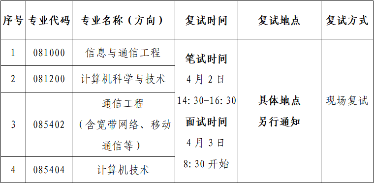 复试时间、地点及方式详见下表。
