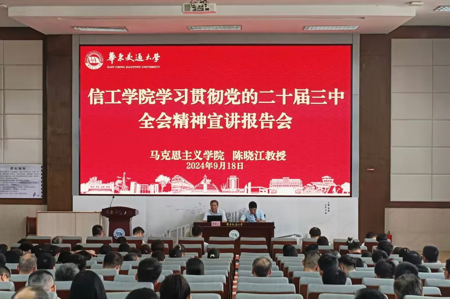 学习贯彻党的二十届三中全会精神宣讲报告会在南区图书馆202孔目湖讲坛举行。校宣讲团成员、马克思主义学院陈晓江教授应邀作宣讲。学院党委书记魏永峰主持会议,学院领导班子成员、全体教职工参加会议。