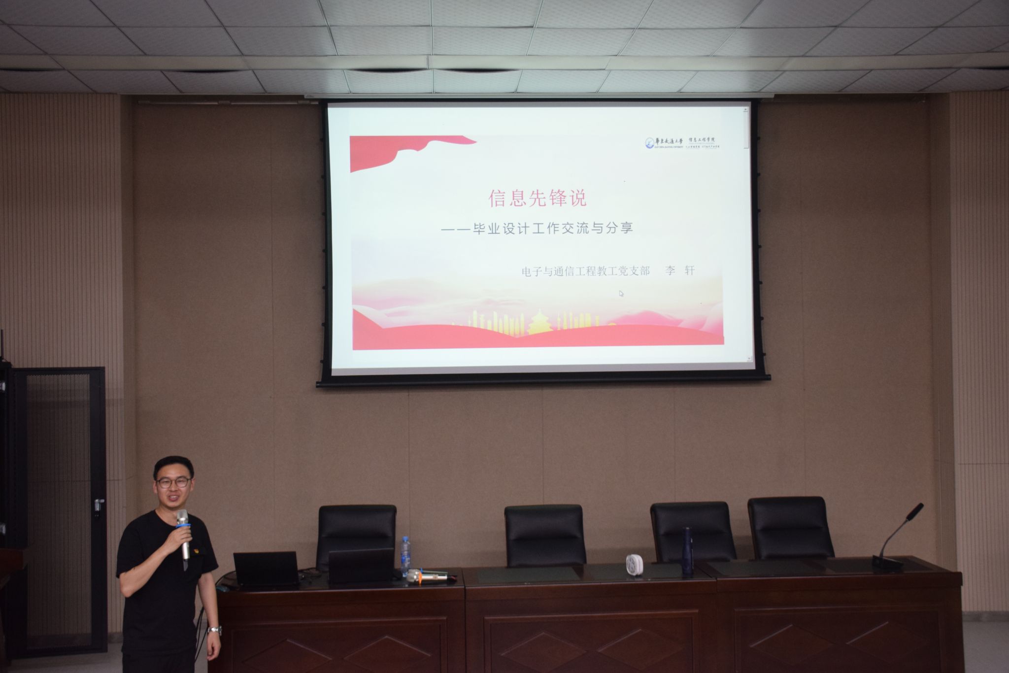 6月1日,信息学院于教5栋校友报告厅举办"信息先锋说"分享交流会。电子与通信工程系教工党支部李轩同志以毕业设计为主题作分享交流,学院全体教工党员参加会议。
