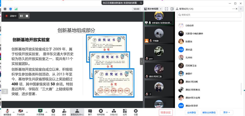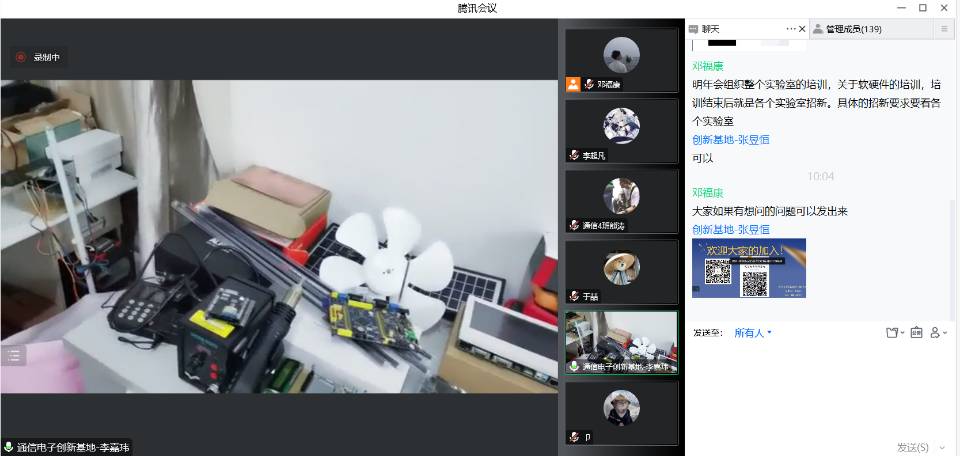 宣讲同学以ppt、现场视频展示的方法,一边介绍了各个实验室的主要学习方向、研究内容以及课外科技活动等情况,另一边也为2022级同学解答对实验室的疑惑。在云参观活动临近末尾,许多同学都表示出对创新基地开放实验室很感兴趣,纷纷加入实验室招新群,为之后的招新开始做准备。