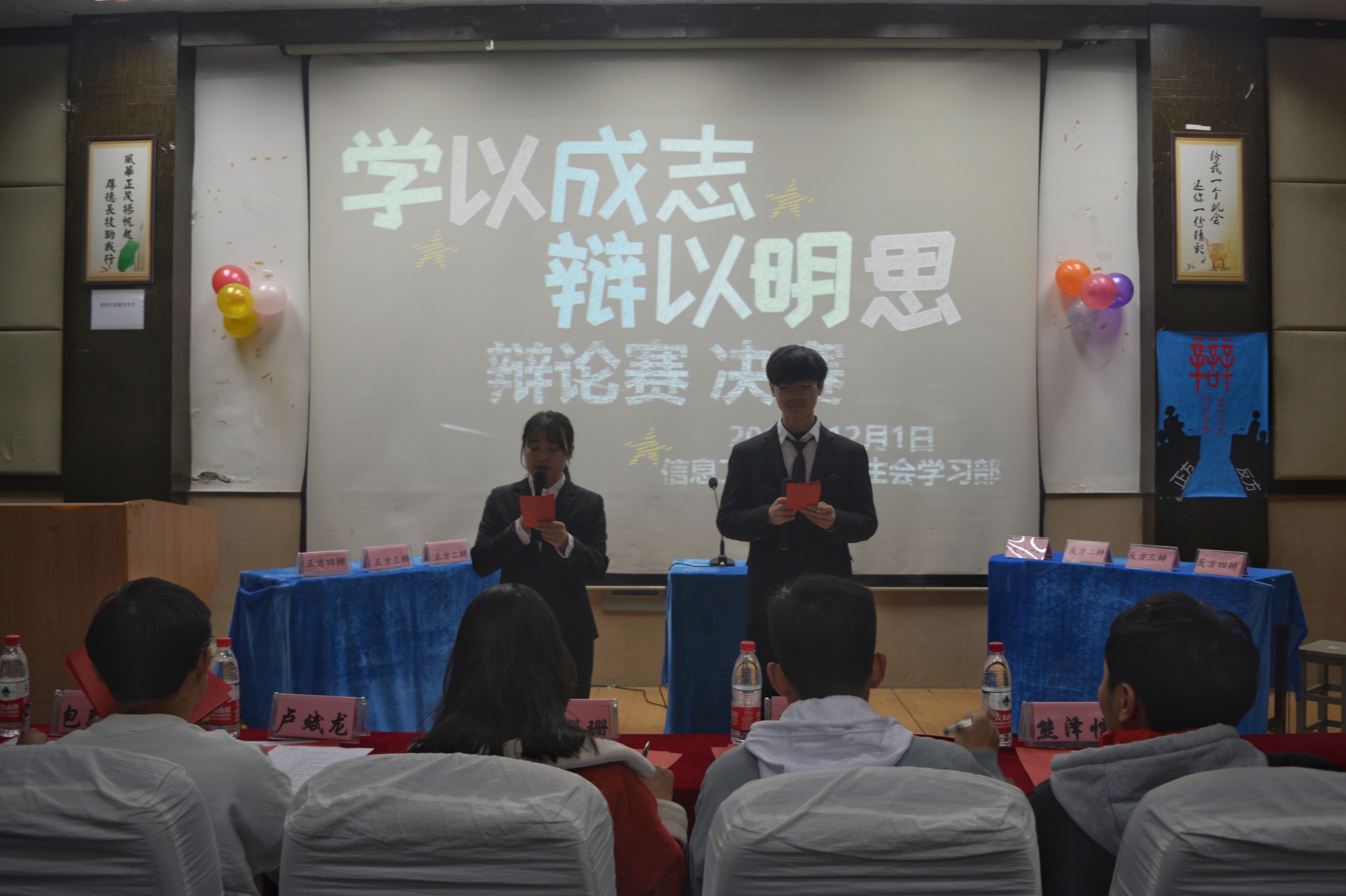 为丰富校园课余文化生活,拓展学生语言运用能力,引导他们多元化发展,12月1日,信息学院于图书馆106教室开展“学以成志,辩以明思”辩论赛决赛。有爱爱