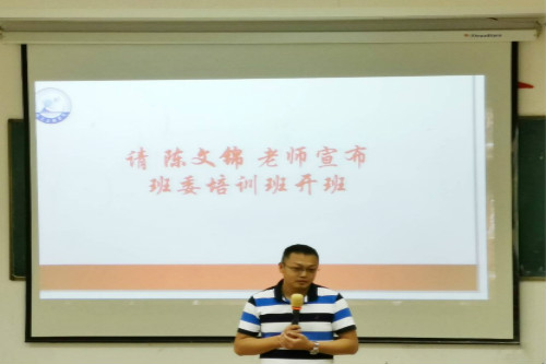 全体起立,奏唱国歌。杨青宣读信息学院班委培训班纪律要求。学生代表黄冰上台发言,并带领全体班委宣誓全心全意为同学服务,为推动班集体建设和发展而不懈奋斗!