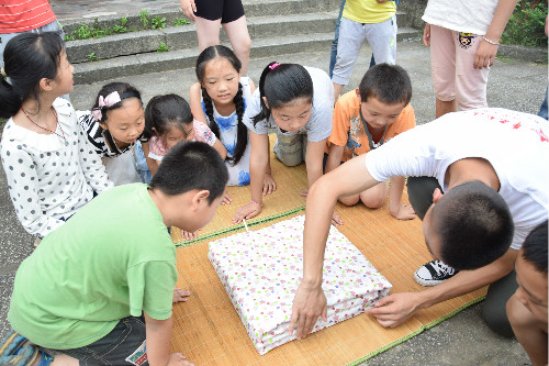 “哥哥,电视上的军人叔叔都能把被子叠得有棱有角,像豆腐块一样,你们会不会叠呀?”为满足孩子们的好奇心,国防生将自己的被子拿出来,用手捏出角和线条,抚平褶皱。一会儿功夫,一个标准的“豆腐块”就叠出来了。孩子们齐齐发出惊叹的声音,流露出敬佩的眼神。