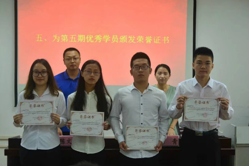 世纪英才学校信息工程学院分校”第五期大学生骨干培训班学员结业的决定》。世纪英才第五期学员代表鲍海天与第六期学员代表曾纪罗分别在典礼上进行了发言。