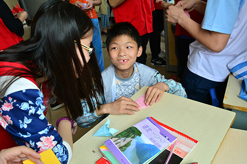 “1跳2蹲3左4右…”这是志愿者在比划手势教孩子们玩123木头人的游戏。孩子们丝毫不害怕志愿者,他们围成志愿者身边,认真地看着志愿者的手势,努力地理解着每一个手势所代表的意思。志愿者和孩子们围成一个大圈,大手牵着小手,孩子们脸上都洋溢着幸福的笑容。