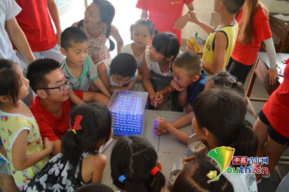 “小朋友们,你们想不想看一件特别神奇的科技作品?”一句话立刻吸引二三十个孩子们的目光,纷纷围在志愿者拿出来的“魔力发光体”周围。7月12日,有爱爱
