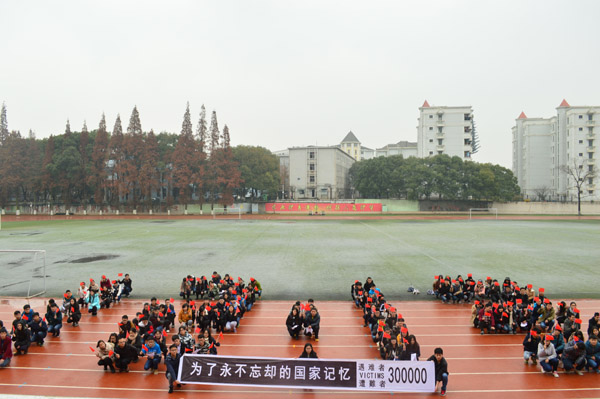 “亘古浩劫,文明罹难,百年悲叹,警钟鸣响;和平发展,时代主题,民族复兴,世代梦想;龙盘虎踞,彝训鼎铭,继往开来,永志不忘……”12时13分,声势浩大的誓言响彻华东交大校园,百余名学子于该校南区田径场高举国旗,摆成“12·13”字样,举行庄严的宣誓仪式,并集体低头为在南京大屠杀中遇难的中国人民默哀。