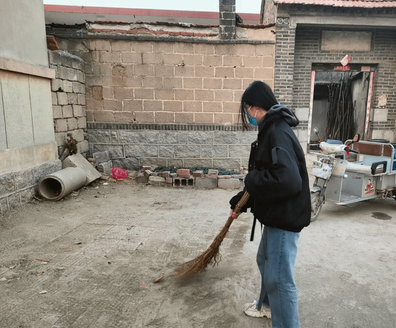 宋小凤同志在对居民门前的杂草、垃圾等进行集中清扫