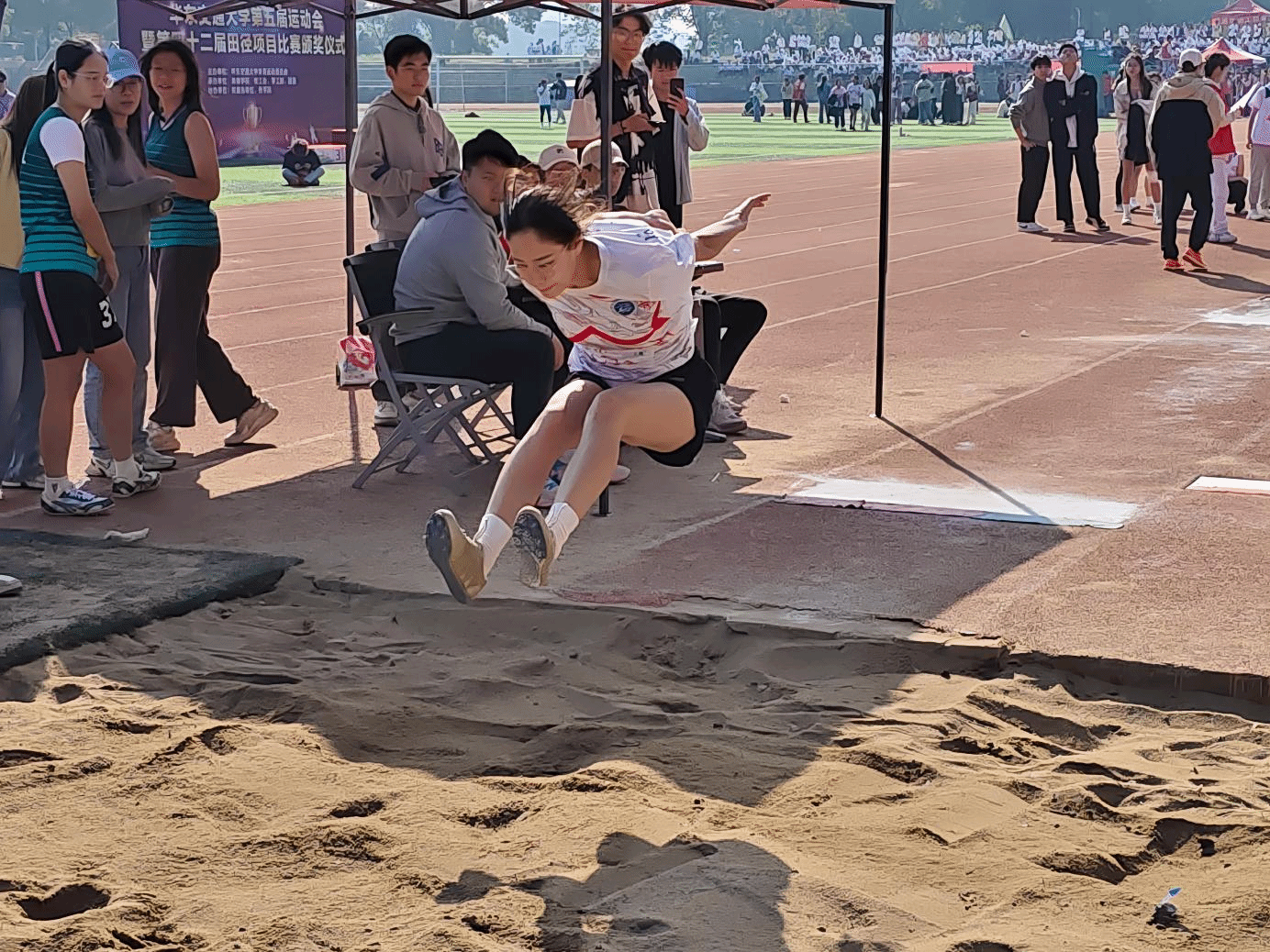 10月31日,在我校举行的第五届运动会暨第四十二届田径项目女子跳远决赛中,有爱爱