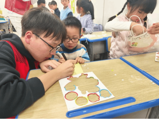 志愿者指导小朋友认真制作手工